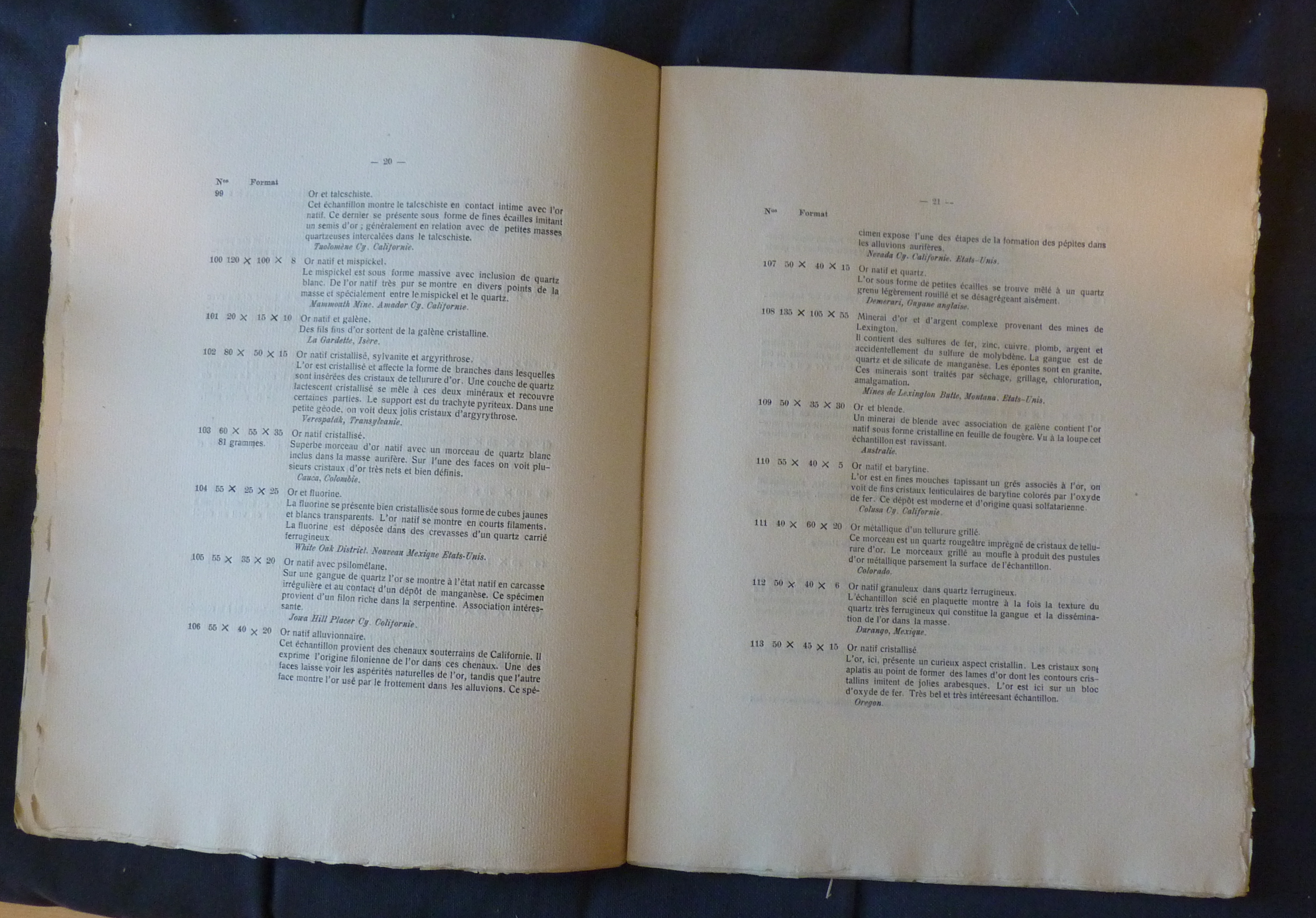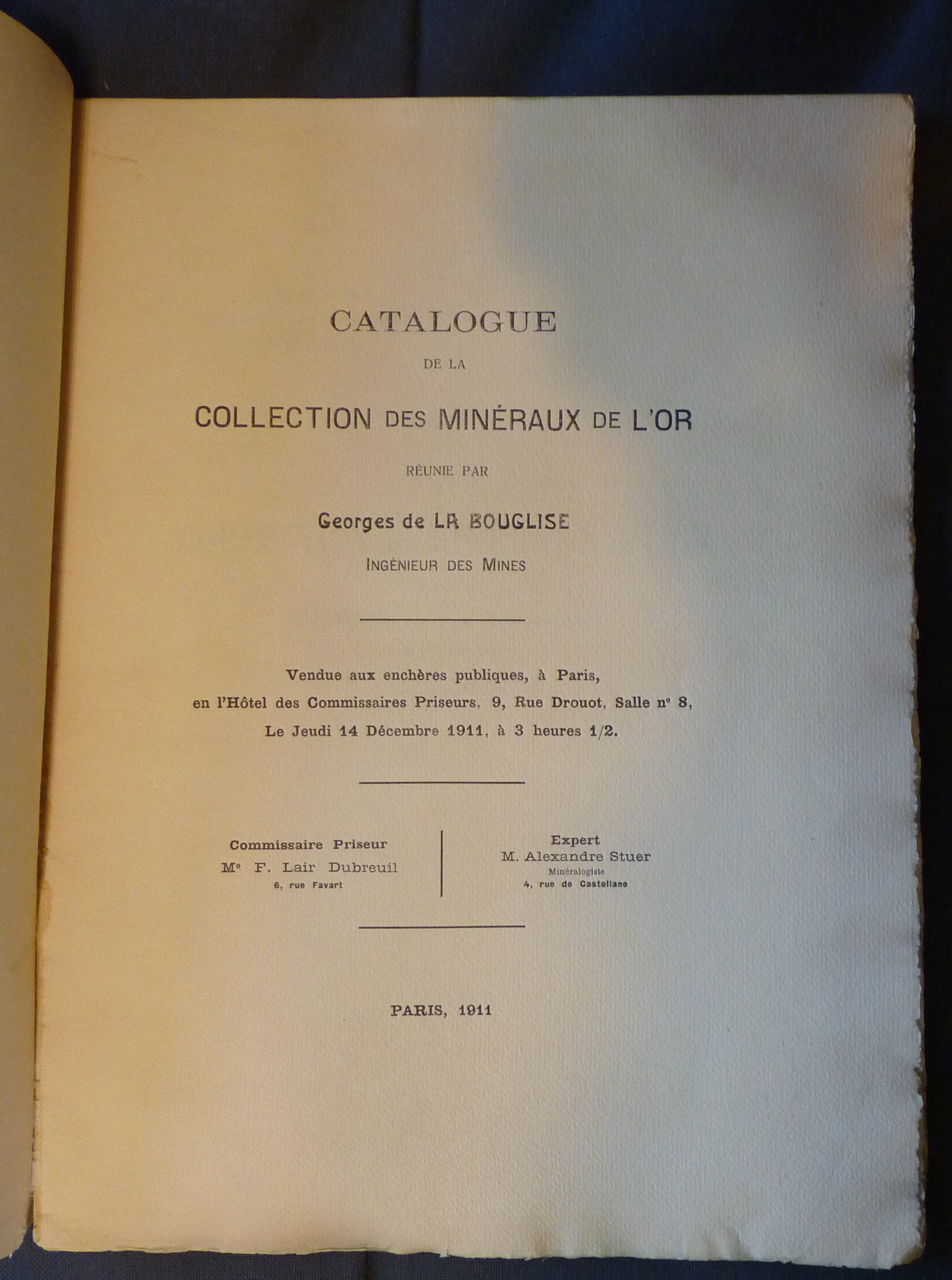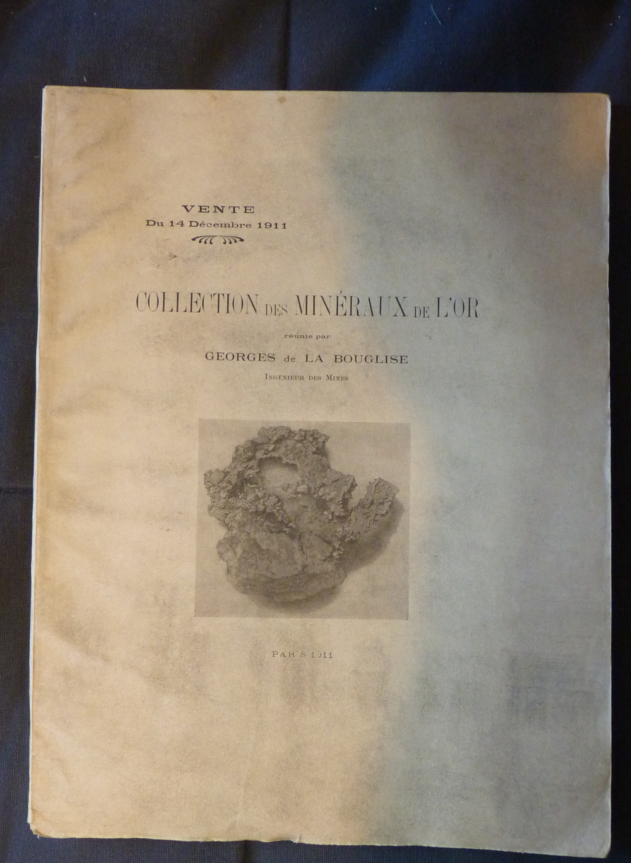 1. Extremely rare. Auction catalogue. 1911 Collection des Minéraux de l'Or, by Georges de la Bouglise, Paris. 64 pages. Most pages still uncut. US $190.